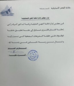 أعلن مجلس إدارة نقابة المهن التمثيلية برئاسة الدكتور أشرف زكى إحالة فكرى صادق إلى جلسة تحقيق عاجلة، للوقوف على حقيقة التصريحات التي نسبت إليه، وتنال من زميل له في ذمة الله.