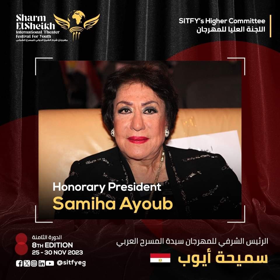مهرجان شرم الشيخ الدولي للمسرح الشبابي يرأسه شرفيا النجمة الكبيرة سميحة أيوب، وتحمل دورته الثامنة اسم الفنانة الكبيرة الدكتورة سميرة محسن.