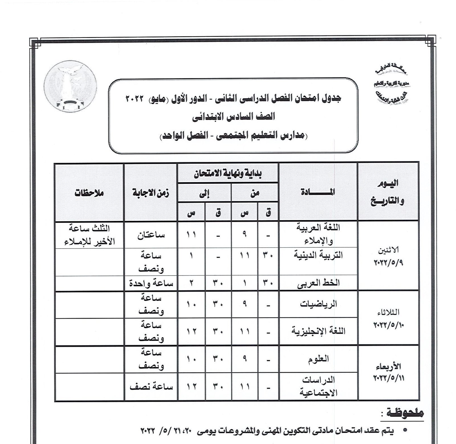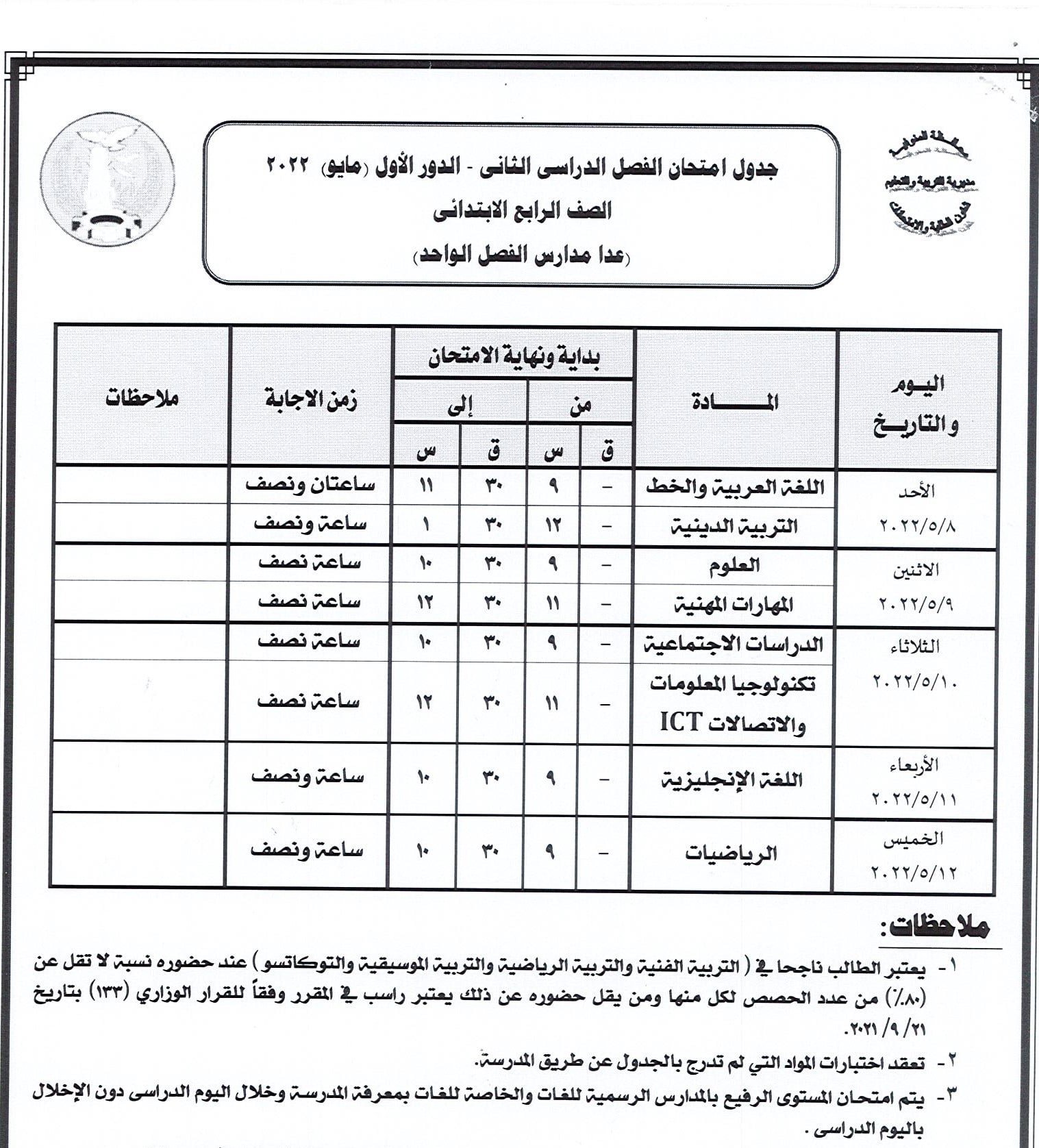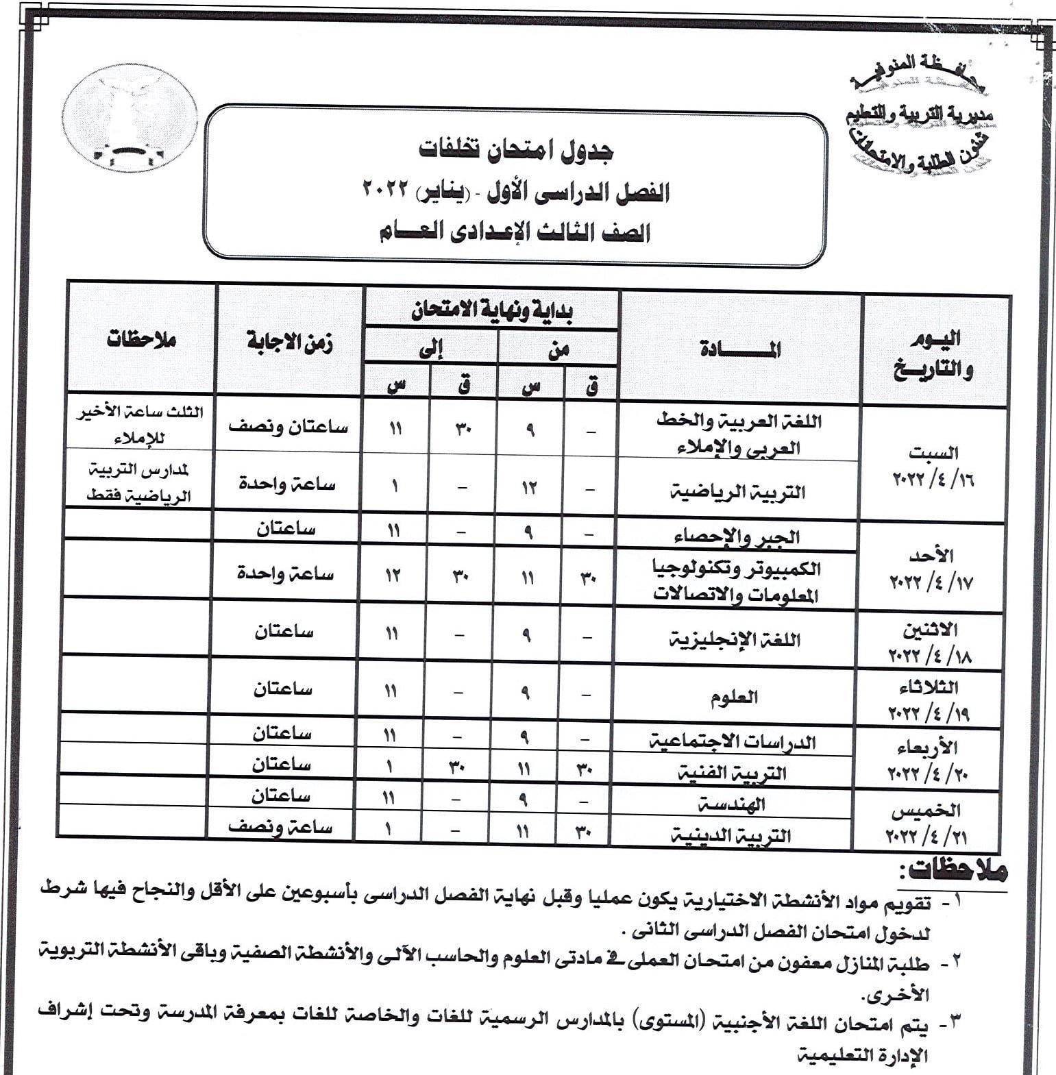 أعلنت مديرية التربية والتعليم بالمنوفية جداول سير امتحانات الدور الأول من العام الدراسي 2021 /2022 لصفوف النقل الابتدائي والإعدادي والشهادة الإعدادية العامة والمهنية ومدارس التربية الخاصة والنقل للتعليم الفني ومدارس التعليم المجتمعي ( الفصل الواحد ) كما أعلنت عن جدول سير امتحان الشهادة الإعدادية العامة للطلبة المتخلفين عن امتحانات الفصل الدراسي الأول يناير 2022 بعذر قبلته جهة الإدارة بعد تقديم المستندات الدالة على العذر حيث تقر عقد امتحان الطلاب الذين تخلفوا عن امتحانات الفصل الدراسي الأول يناير 2022 في لجنة واحدة ومقرها مدرسة السلام الابتدائية بشبين الكوم أمام ديوان المديرية بدء من يوم السبت الموافق 16 ابريل الجاري حتى الخميس الموافق 21 من ابريل 2022 ووفقا للجدول المرفق .
