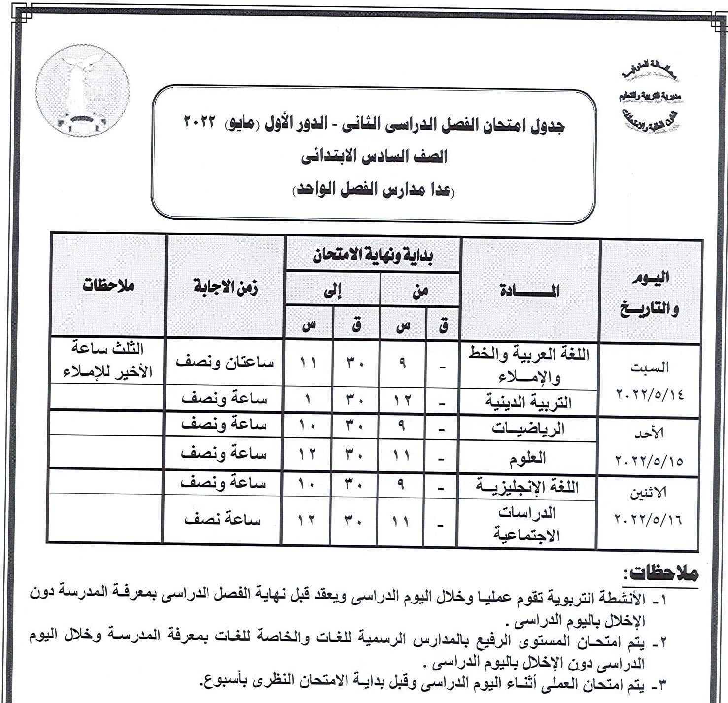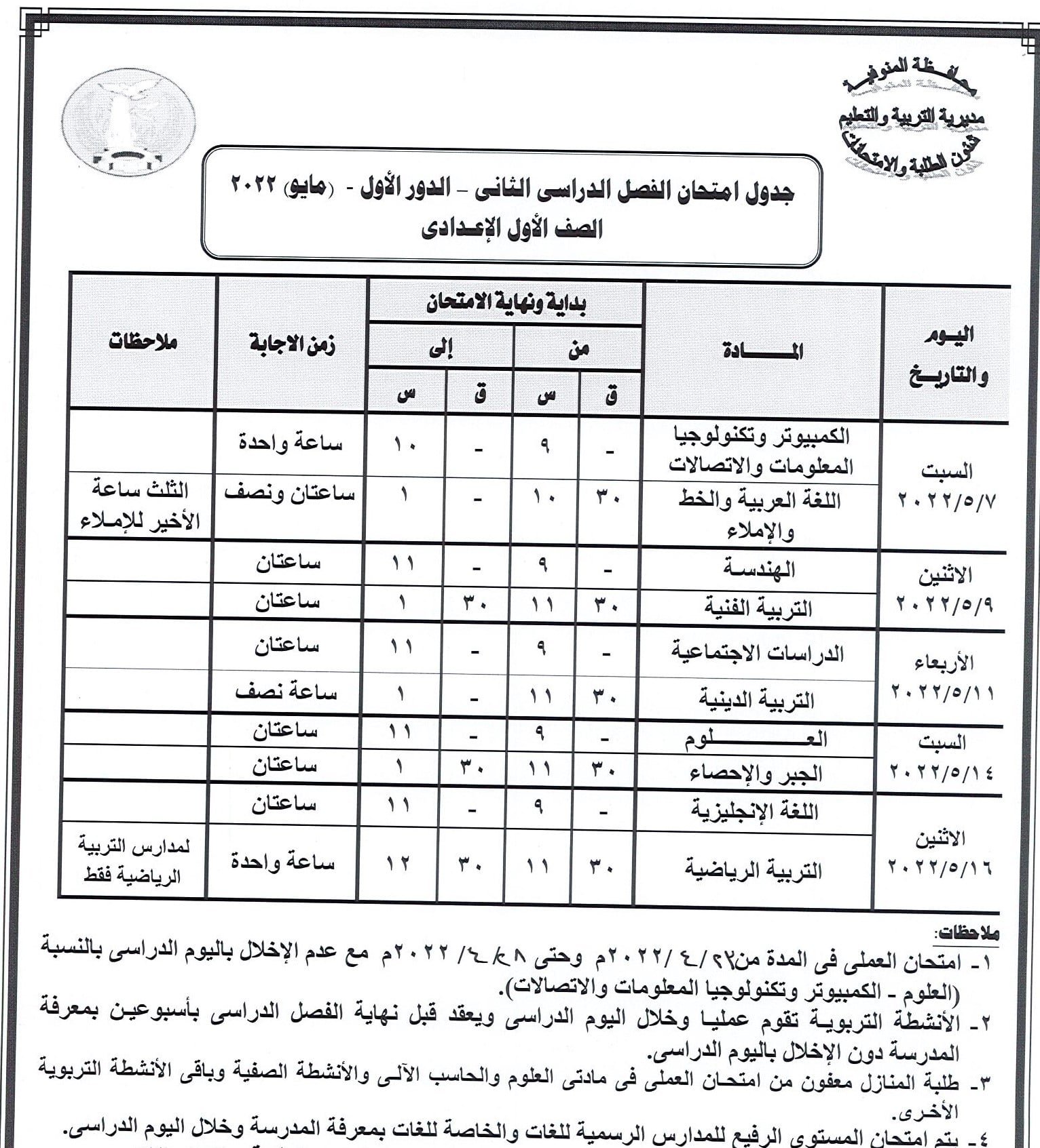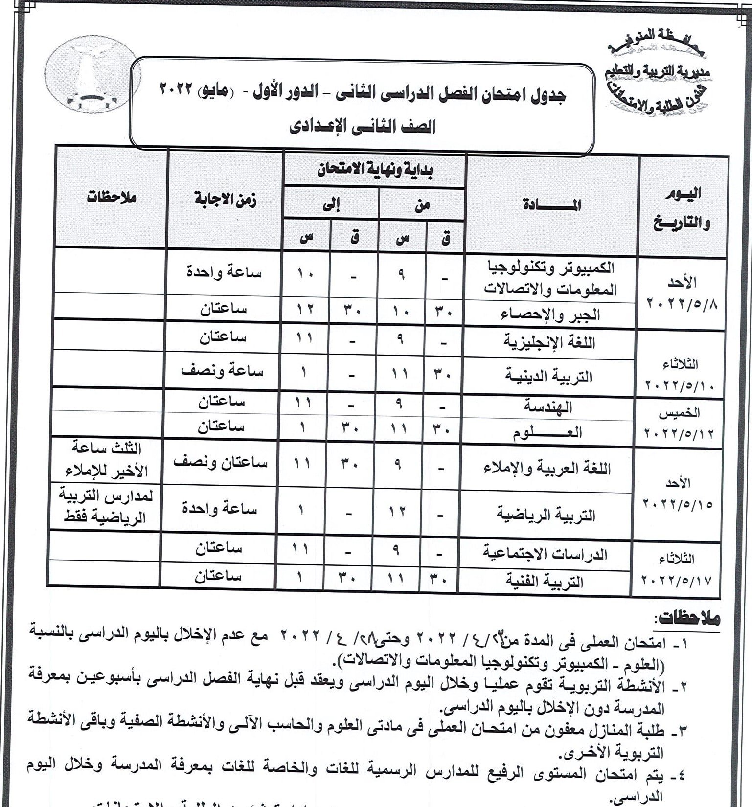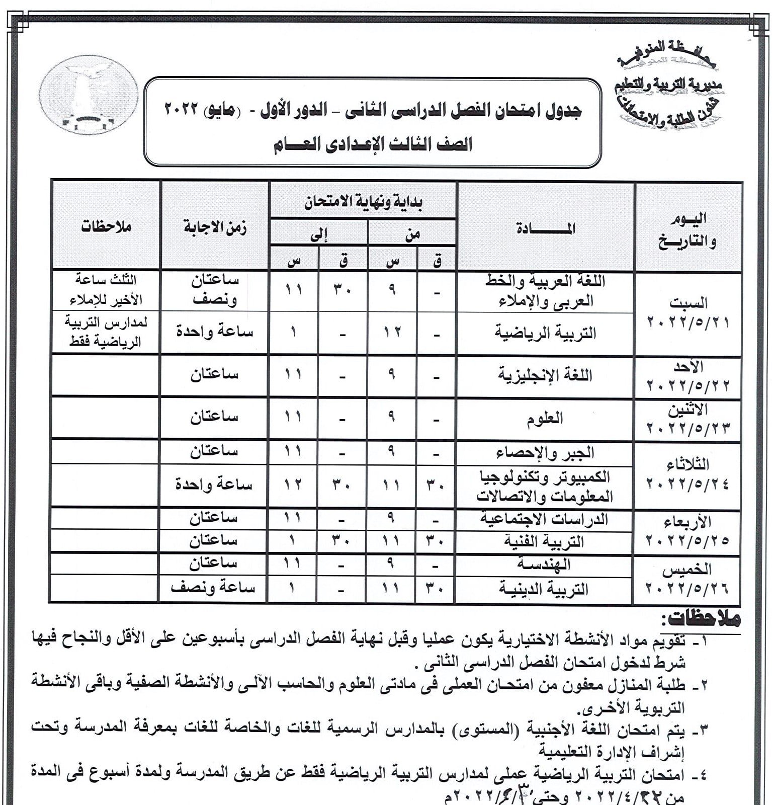 جدول امتحانات النقل والشهادة الإعدادية بالمنوفية