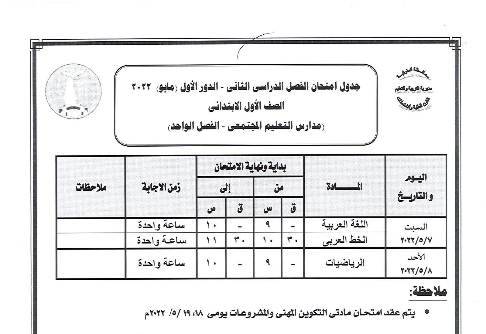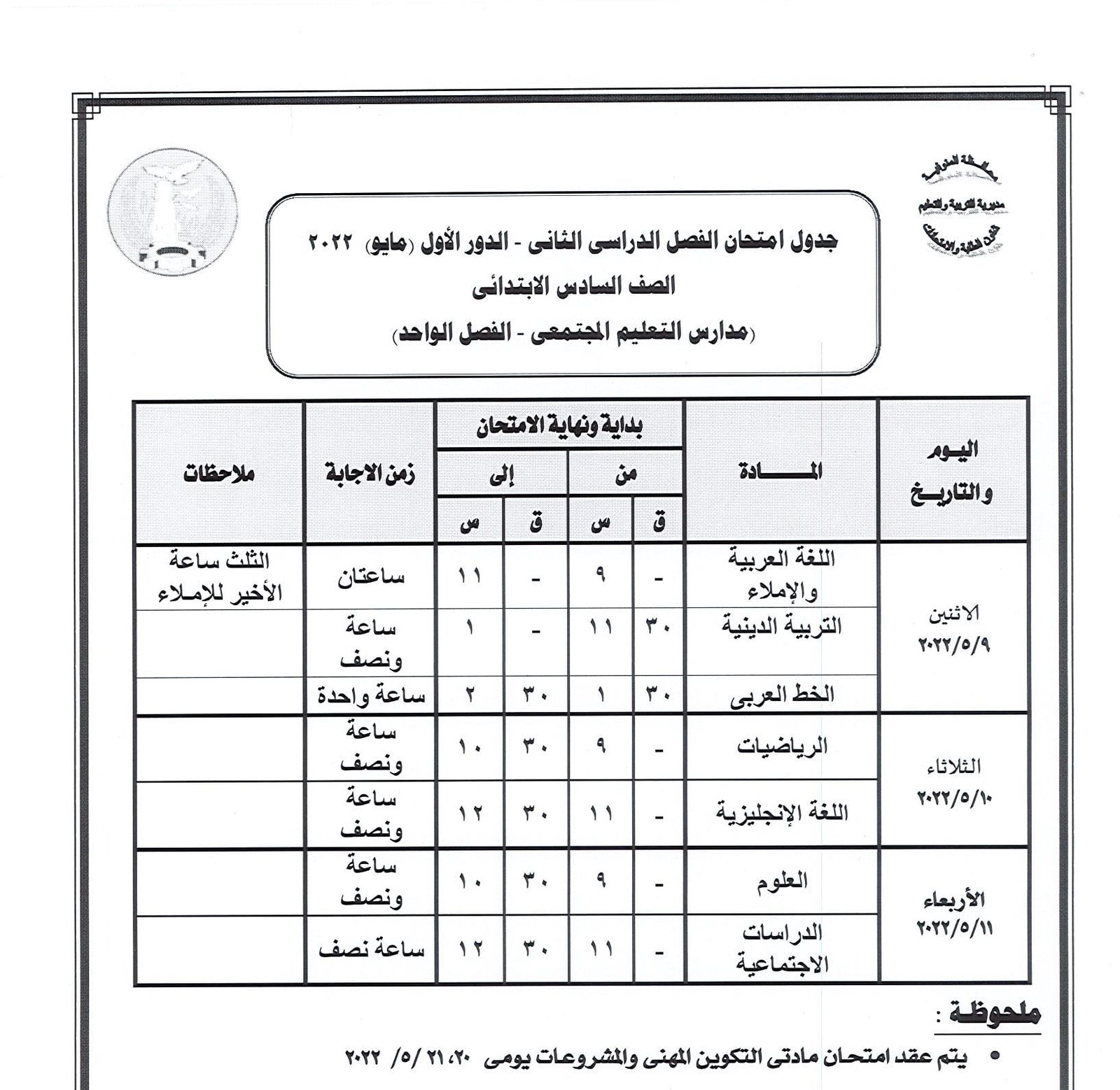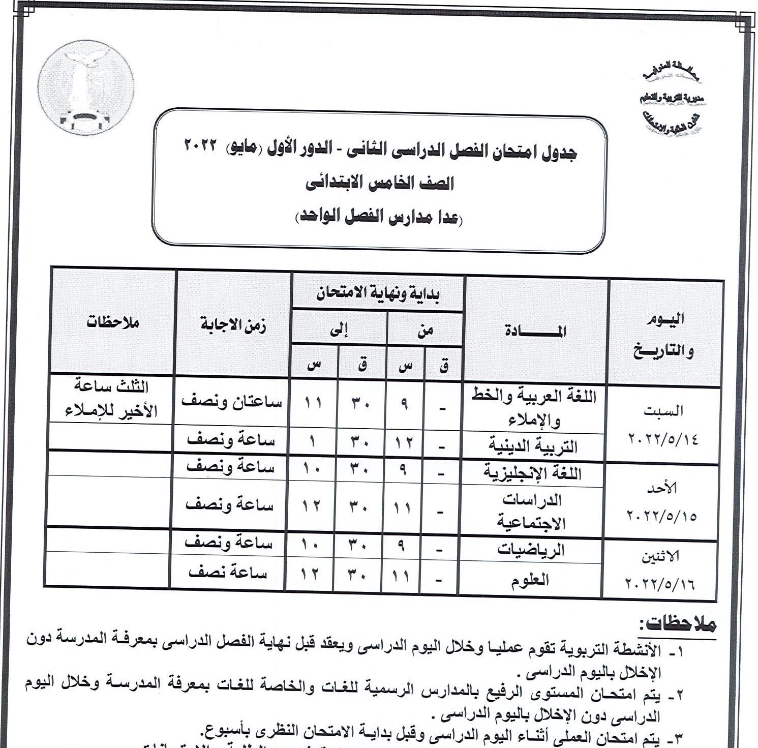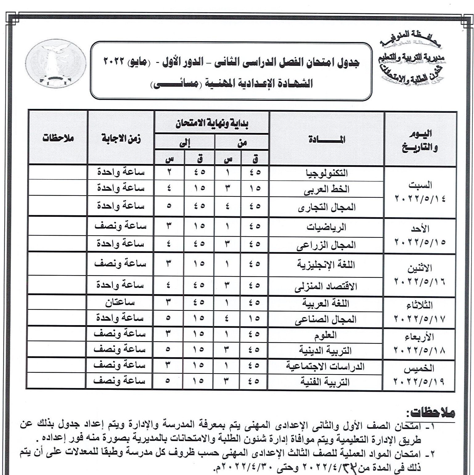 جدول امتحانات النقل والشهادة الإعدادية بالمنوفية