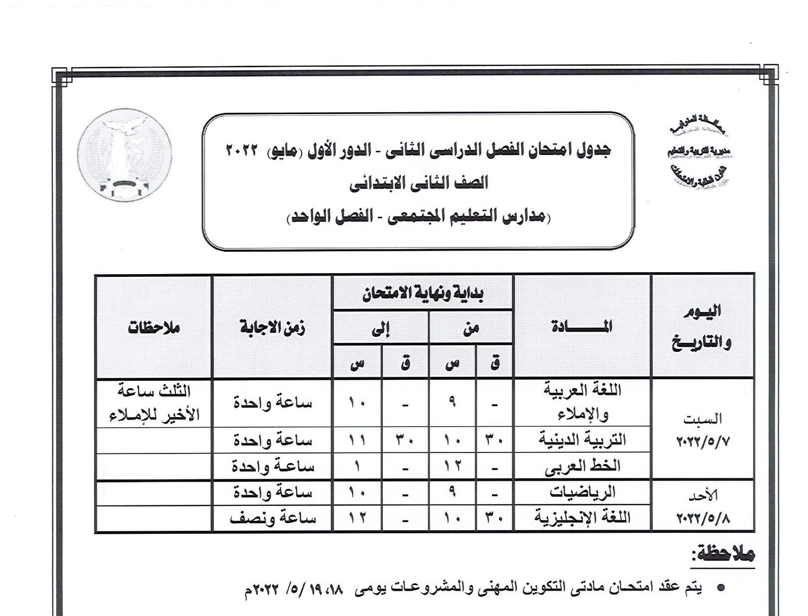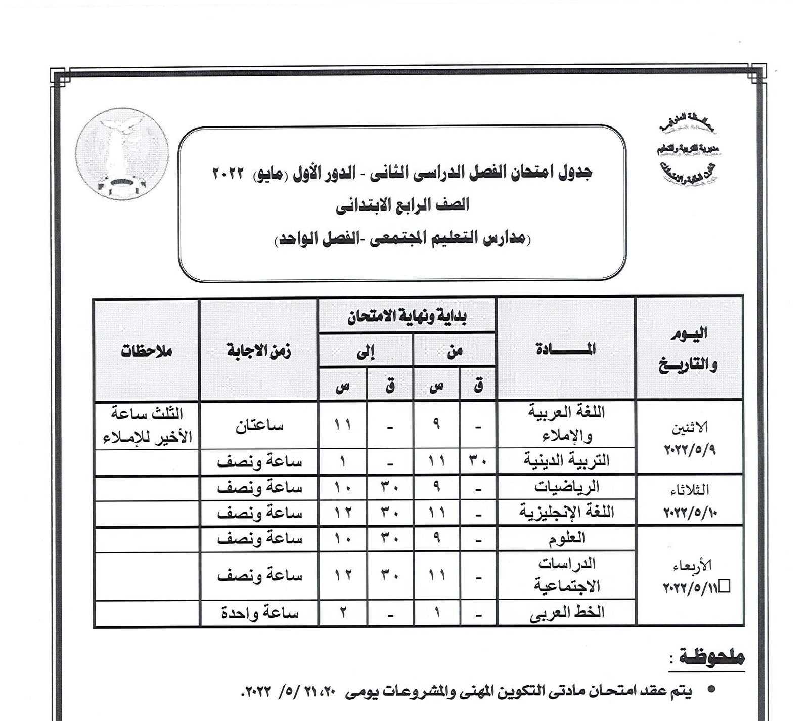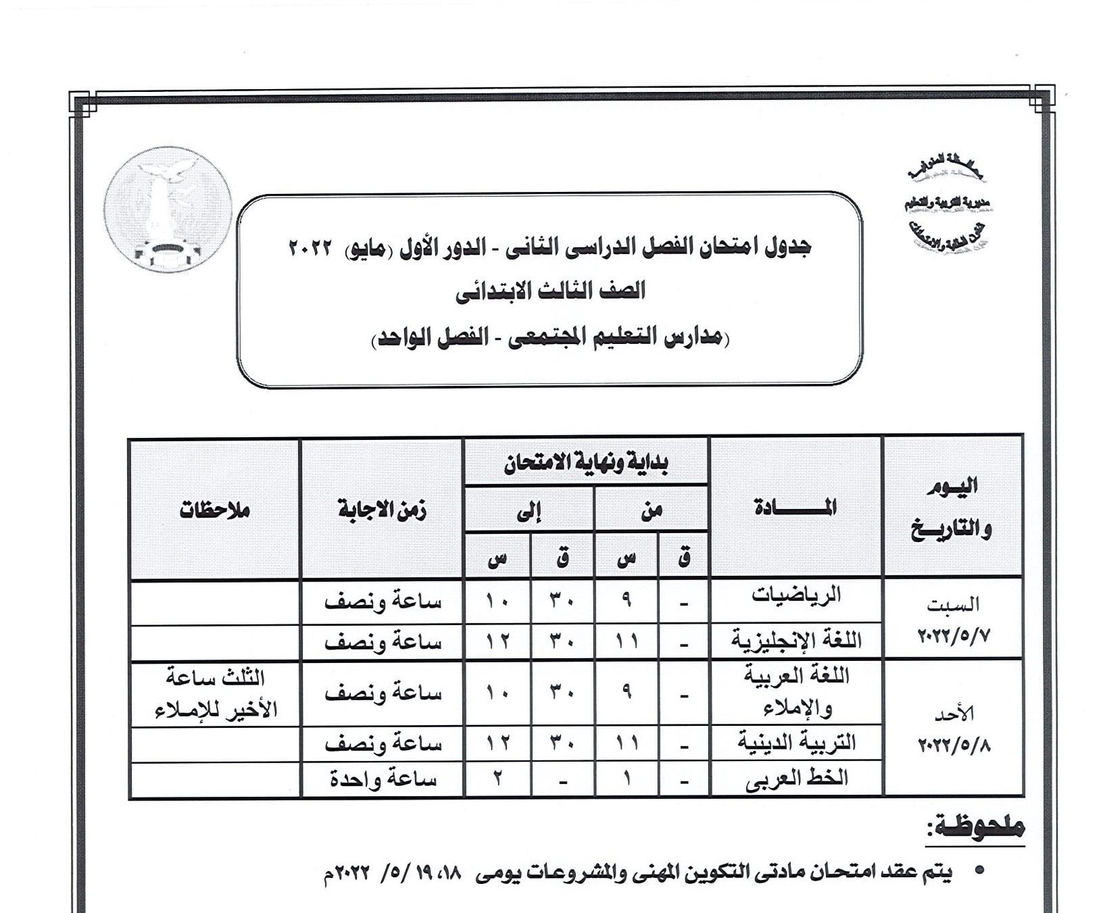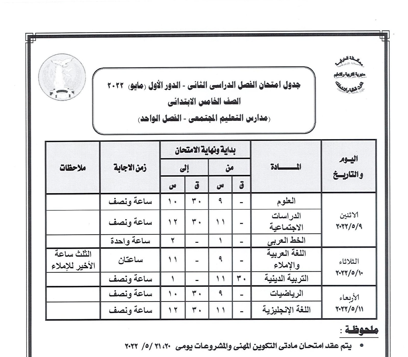 جدول امتحانات النقل والشهادة الإعدادية بالمنوفية