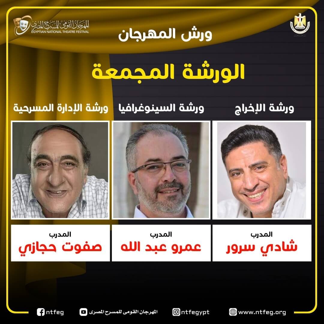 الورش يقدمها خبراء متخصصون كل في مجاله، فورشة التمثيل يقدمها الفنان أحمد مختار، وورشة الإلقاء يقدمها الفنان خالد عبد السلام، وكذلك ورشة في الإخراج المسرحي يقدمها الفنان والمخرج شادي سرور، وورشة السينوغرافيا يقدمها مهندس الديكور والإضاءة عمرو عبد الله الشريف، وورشة الإدارة المسرحية يقدمها الأستاذ صفوت حجازي.