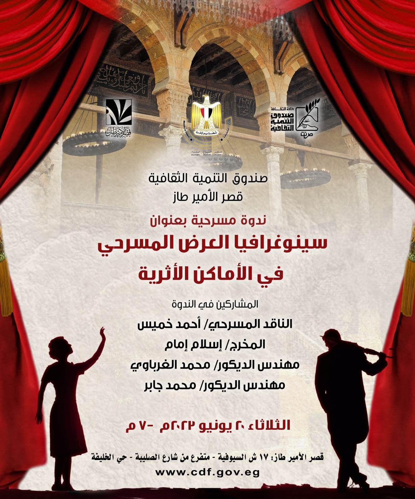 يقيم صندوق التنمية الثقافية برئاسة الدكتور هانى أبو الحسن سلام ندوة بعنوان (سينوغرافيا العرض المسرحي في الأماكن الأثرية ) وذلك بقصر الأمير طاز الساعة 7 مساء غداً الثلاثاء الموافق 20/6/ 2023