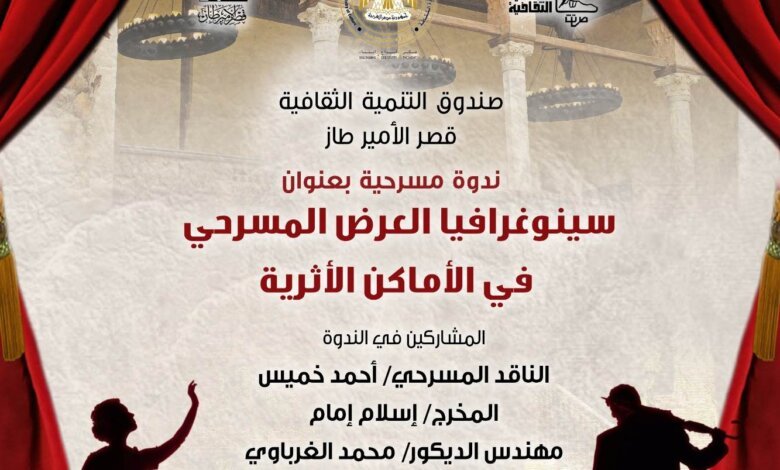 يقيم صندوق التنمية الثقافية برئاسة الدكتور هانى أبو الحسن سلام ندوة بعنوان (سينوغرافيا العرض المسرحي في الأماكن الأثرية ) وذلك بقصر الأمير طاز الساعة 7 مساء غداً الثلاثاء الموافق 20/6/ 2023
