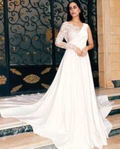 كما ترشح آمال شوكت فساتين الزفاف المصممة بخط عنق على T-shirt neckline للعرائس ذوات الصدر الصغير و الأكتاف الضيقة.