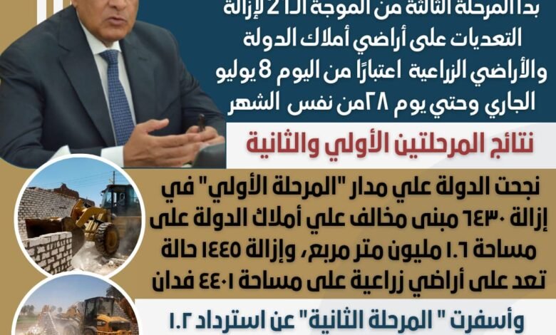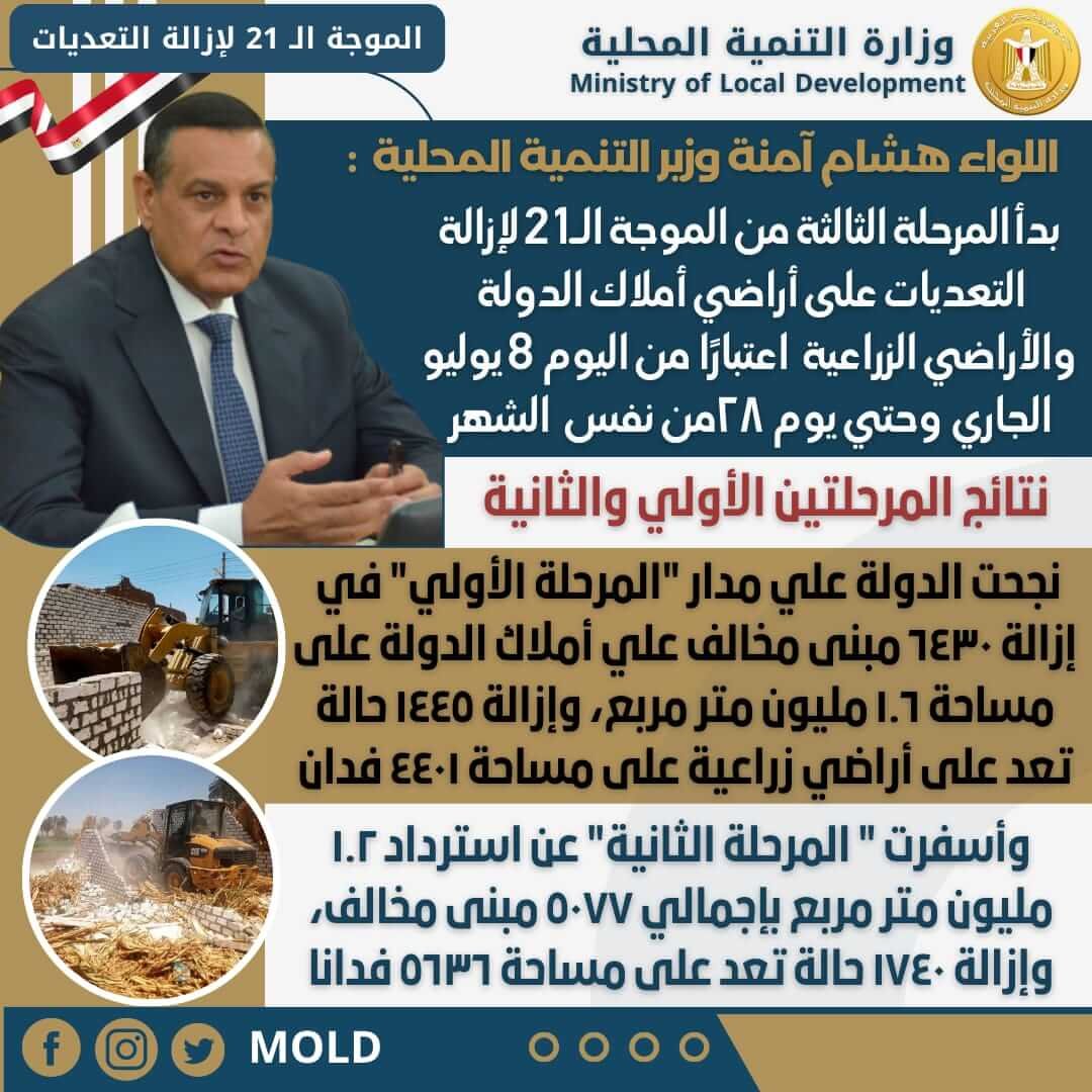 أعلن اللواء هشام آمنة وزير التنمية المحلية، عن بدء المحافظات اليوم السبت ٨ يوليو، في تنفيذ المرحلة الثالثة والأخيرة من الموجة الـ ٢١ لإزالة التعديات على الأراضي المملوكة للدولة والأراضي الزراعية وتستمر حتى يوم ٢٨ من نفس الشهر، وذلك تنفيذاً لتوصيات لجنة استرداد أراضي الدولة.