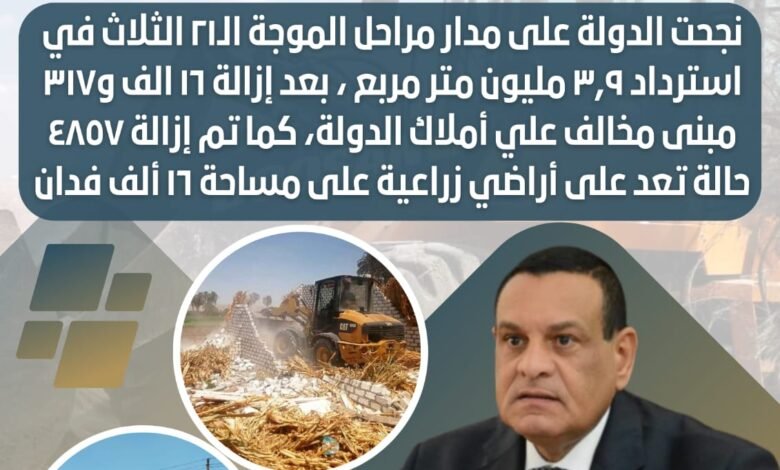 وكشف اللواء هشام آمنة، عن جهود الأجهزة التنفيذية بالمحافظات وجهات الدولة المختلفة التي نجحت على مدار مراحل الموجة الـ٢١ الثلاث في استرداد ٣,٩ مليون متر مربع من جميع المحافظات، بعد إزالة ١٦ ألف و٣١٧ مبنى مخالف علي أملاك الدولة، كما تمكنت أيضاً من إزالة ٤٨٥٧ حالة تعد على أراضي زراعية على مساحة ١٦ ألف فدان، كما تم إزالة ٣٤٩ مخالفة استزراع سمكي بمساحة ٢٧٧٩ فدانا بمحافظة بورسعيد .